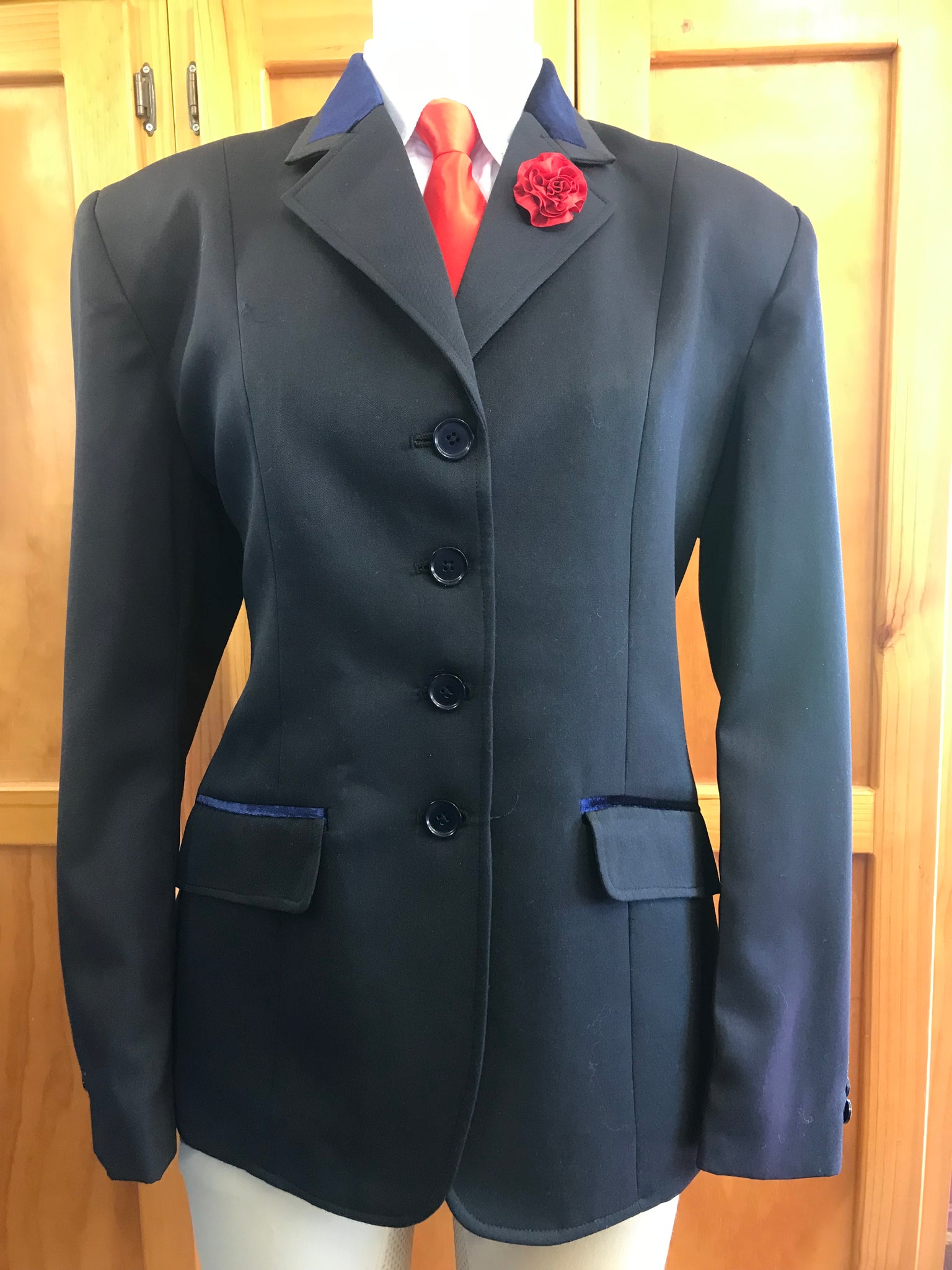 We Have This Navy Open Dressage Jacket Navy Velvet Trims and Buttons, Adults Jacket Now Available. This Jacket Is Perfect For Someone Who Loves To Stand Out In The Ring. Available In Adults Size 16 Only.